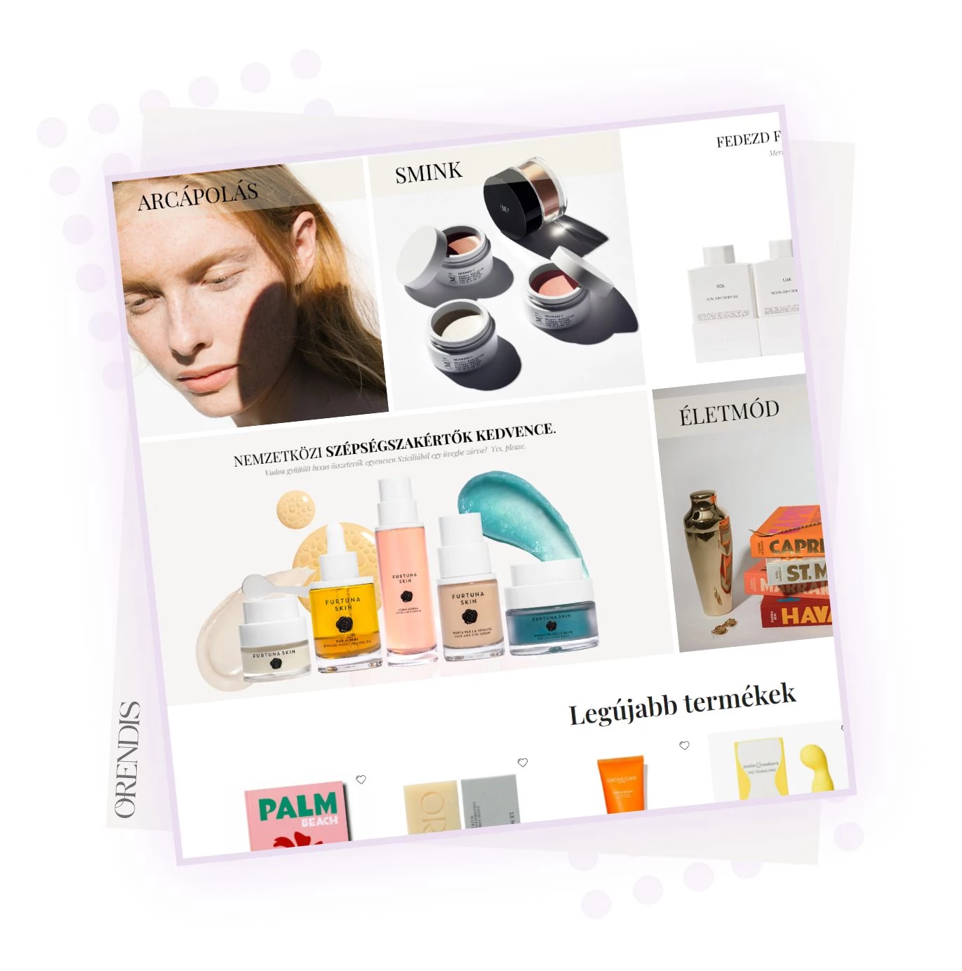 Amikor Attila és a lánya, Fanni megkeresett minket 2021 tavaszán az Orendis webáruház elkészítésének feladatával, már régi ismerősként kezdtünk a munkába, mivel 2020-ban mi készítettük Attila Top-Model webshopjának a designját, illetve néhány a webáruház eredeményesebb működését biztosító beállítás elvégzésében is részt vettünk. Az Orendis kapcsán nem csak egy teljesen egyedi design megalkotása volt a feladatunk, hanem ránk bízták a beállításhoz, termékfeltöltéshez kapcsolódó feladatokat is. Fanniék célja volt, hogy az Orendis kínálatában a modern nő igényeit kielégítő, általuk gondosan válogatott, szépségápolási, lifestyle márkák termékei váljanak elérhetővé Magyarországon. A prémium életérzés megteremtése online teljesen egyedi design és fejlesztési megoldásokat kívánt. Ezt a célt hivatott szolgálni a betöltéskor látható logó animáció, valamint az oldal görgetésekor használt felhasználói élményt fokozó un. gördülő animációk, továbbá a letisztult, finom színvilág alkalmazása, illetve a nagy látványos képi elemek használata is. A végeredmény - Fanni és Attila legnagyobb megelégedésére - egy igazán izgalmas webshop lett, egyedi termékoldalakkal, egyedi lenyíló kategória menükkel, hangsúlyos termékajánlókkal.